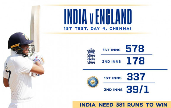 डिजिटल डेस्क, चेन्नई। भारत-इंग्लैंड के बीच चेन्नई के एम.ए चिदंबरम स्टेडियम में पहला टेस्ट मैच के आखिरी दिन का खेल जारी है। भारत मैच के चौथे दिन दूसरी पारी में 1 विकेट गंवाकर 39 रन बना लिए हैं। मैच जीतने के लिए भारत 381 रनों की जरूरत है। भारत की ओर से चेतेश्वर पुजारा (12) शुभमन गिल (15) रनों पर नाबाद हैं।