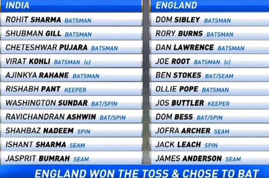 इंग्लैंड : रोरी बर्न्स, डोमिनिक सिबली, डैनियल लॉरेंस, जो रूट (कप्तान), बेन स्टोक्स, ओली पोप, जोस बटलर (विकेटकीपर), डोमिनिक बेस, जोफ्रा आर्चर, जैक लीच, जेम्स एंडरसन